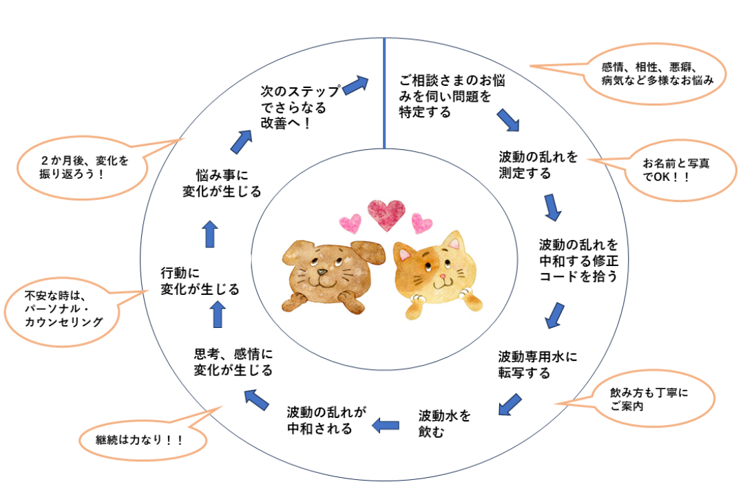 波動カウンセリングでは、ご相談者様の身体や心、精神等の乱れた波動、ネガティブな波動を測定し、それを中和するための修正コードを拾い出し、転写した波動水を作って飲んでいただきます。現実に起きている問題、悩み事の根本原因の多くは、潜在意識いわゆる無意識領域に存在しています。自分の力だけでは如何ともし難い自己のうちにあるネガティビティについて、その出所や影響を示し、そのネガティビティをポジティビィティへと変容させるプロセスにおいて大きな支援となってくれます。